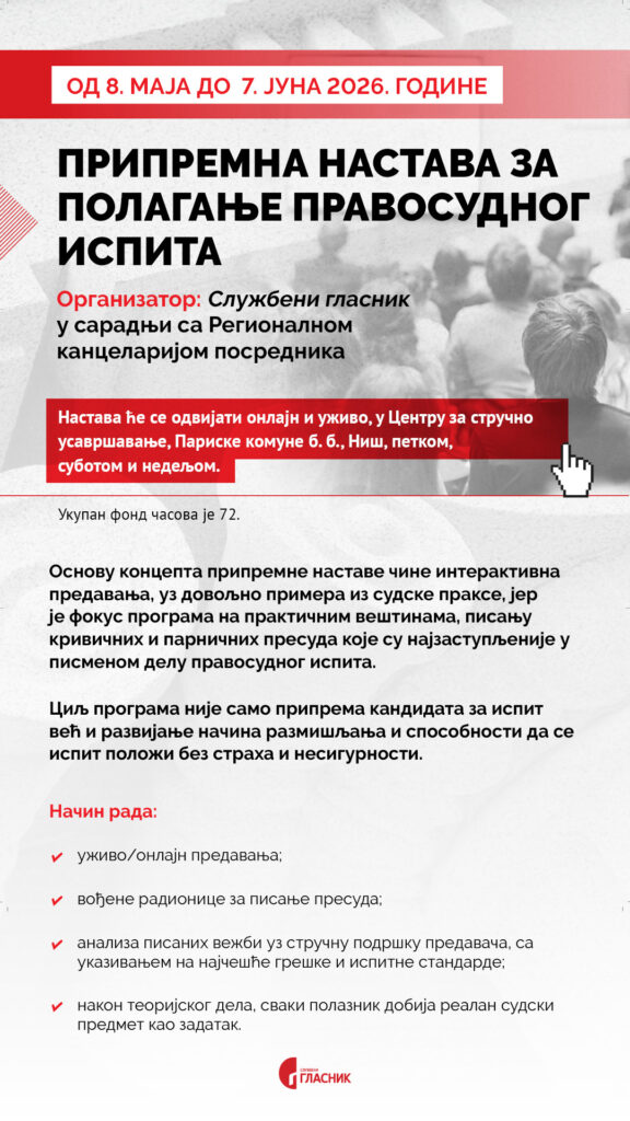 Od 8. maja do 7. juna, u Centru za stručno usavršavanje biće realizovan sveobuhvatan program intenzivne pripreme za polaganje pravosudnog ispita, u organizaciji Službenog glasnika, namenjen kandidatima koji teže visokom nivou stručne i praktične osposobljenosti.